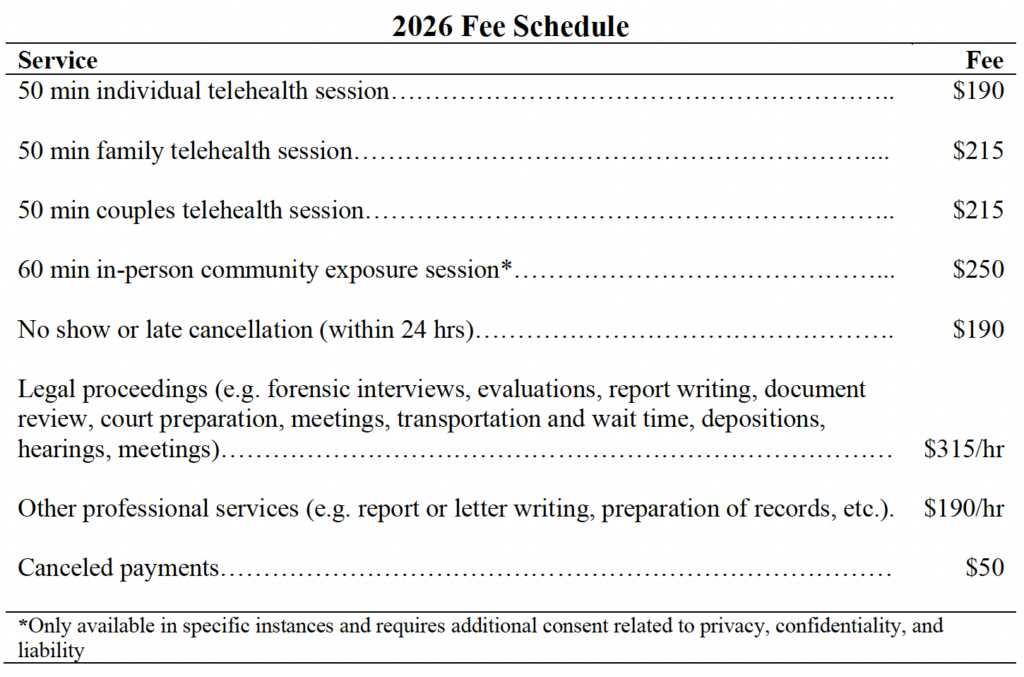 50-minute therapy sessions cost $190-$215 depending on the type of therapy. We are currently out-of-network providers, so you can only use insurance if you have out-of-network benefits. If you choose to use these benefits, we will give you a ‘superbill’ with all the information required to submit a claim to your insurance carrier. It is important to note that we will ask you to commit to ~12 weeks of regular weekly therapy initially to ensure the best possible outcomes, which is a significant financial investment. If cost will be a barrier for you, please give us a call to discuss sliding scale and other low cost options.